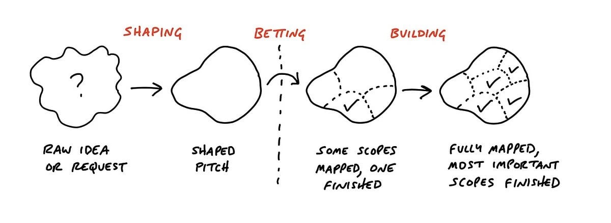 The final stage, Building, is where the rubber meets the road. Teams break down the chosen solution into scopes of work and utilize the Hill Chart, a progress-tracking tool unique to Shape Up, to track development. The six-week cycle for this stage offers a fixed timeline that encourages efficiency and discourages endless design edits (final_final_2_final.fig).